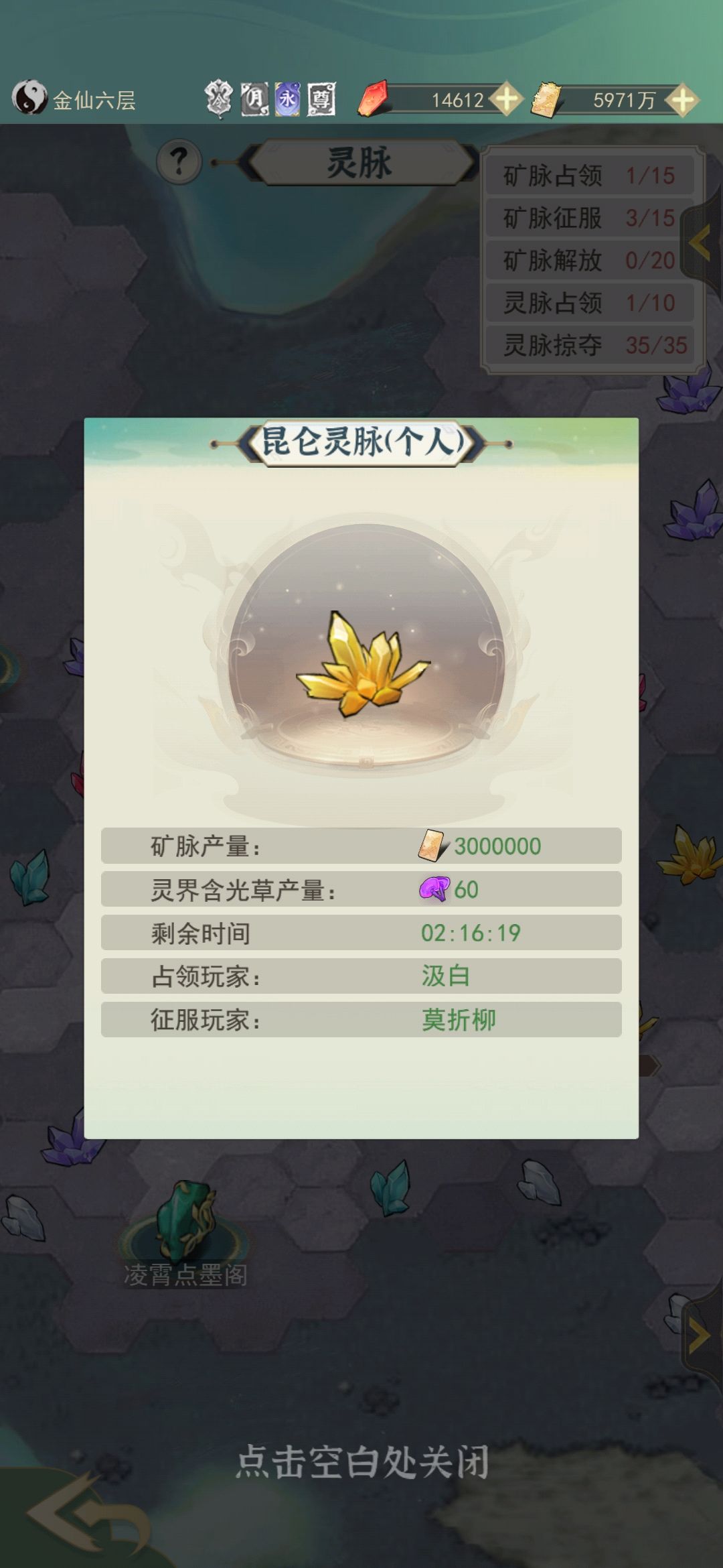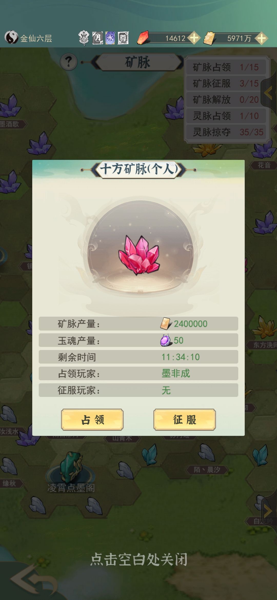 2.矿脉的选择:玉魂和灵界含光草急缺!在人界时只占领和征服玉魂矿脉,飞升灵界后就选择灵界含光草