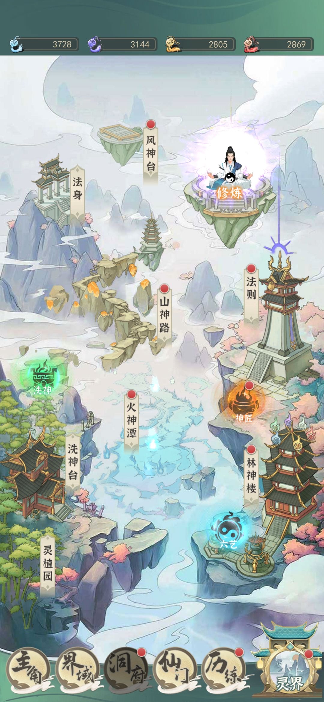 16.灵界建筑:除了洗神台(把宠物放进去提升宠物属性)和飞升台升满,其他的风火山林建筑点个几级就够了,后期是溢出的
