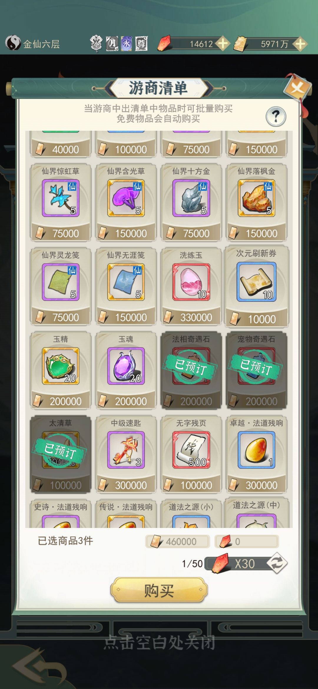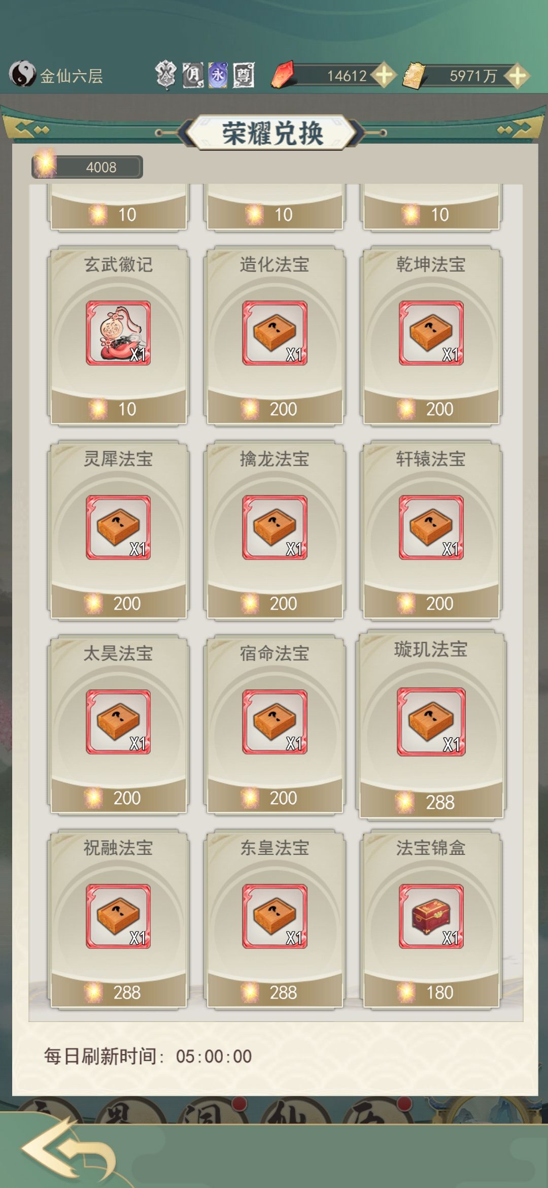 1.斗法商店:法宝盒子只选擒龙和太昊,开乌龟壳和爪子提升修炼速度,后期满了可以选择赌人品开羽化拿瓶子提升果子上限