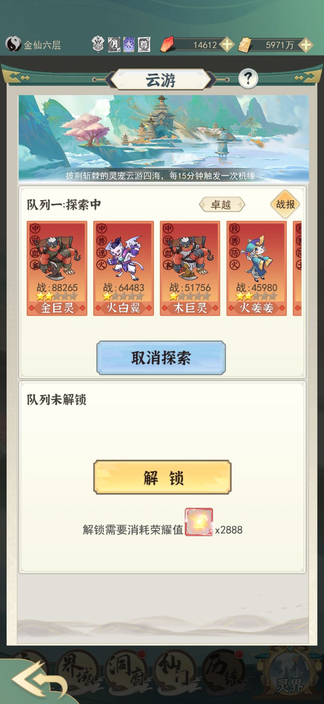 4.灵界云游:飞升前留够2888荣耀值用来开启队列一!