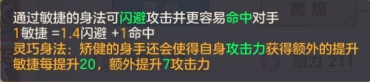 如图所示,敏捷属性是增加命中和闪避,命中在当前版本中是非常重要的,无论你伤害多高,如果命中不达标输出率会大打折扣,而闪避则是敏捷属性的核心价值所在。