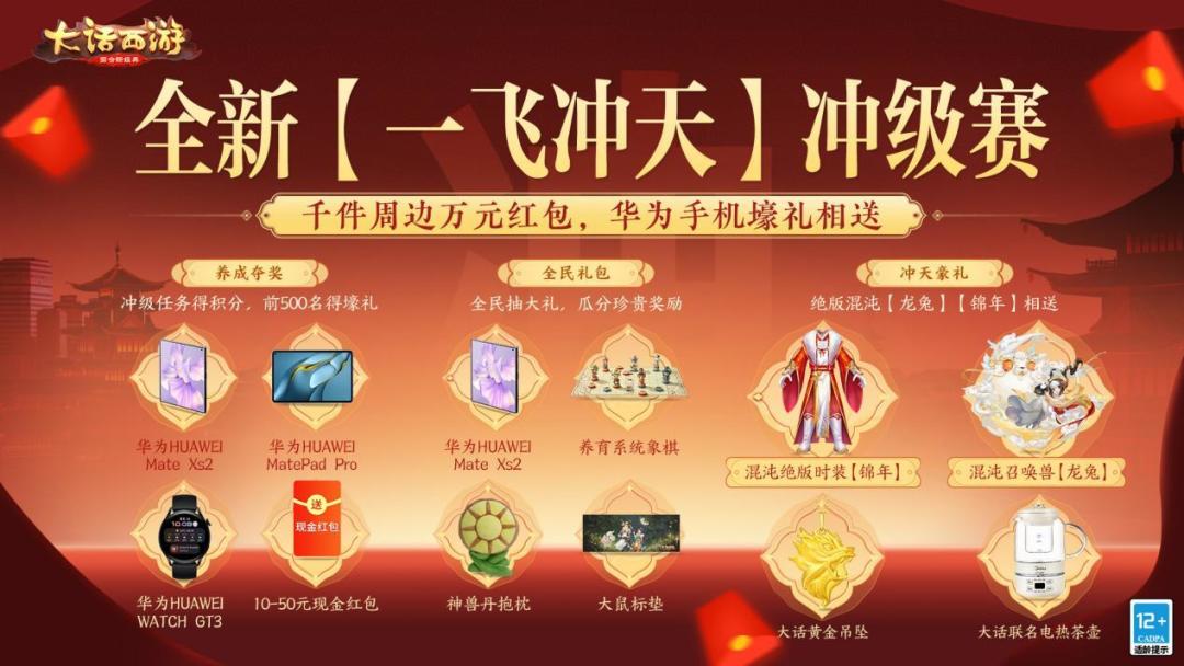 不仅如此,在冲级赛进行过程中,达到不同进度时,全服玩家都可领取华为锦鲤礼包,有机会抽取华为Mate Xs 2手机,还能赢取养育系统象棋、神兽丹抱枕、大话鼠标垫等各种精美周边!