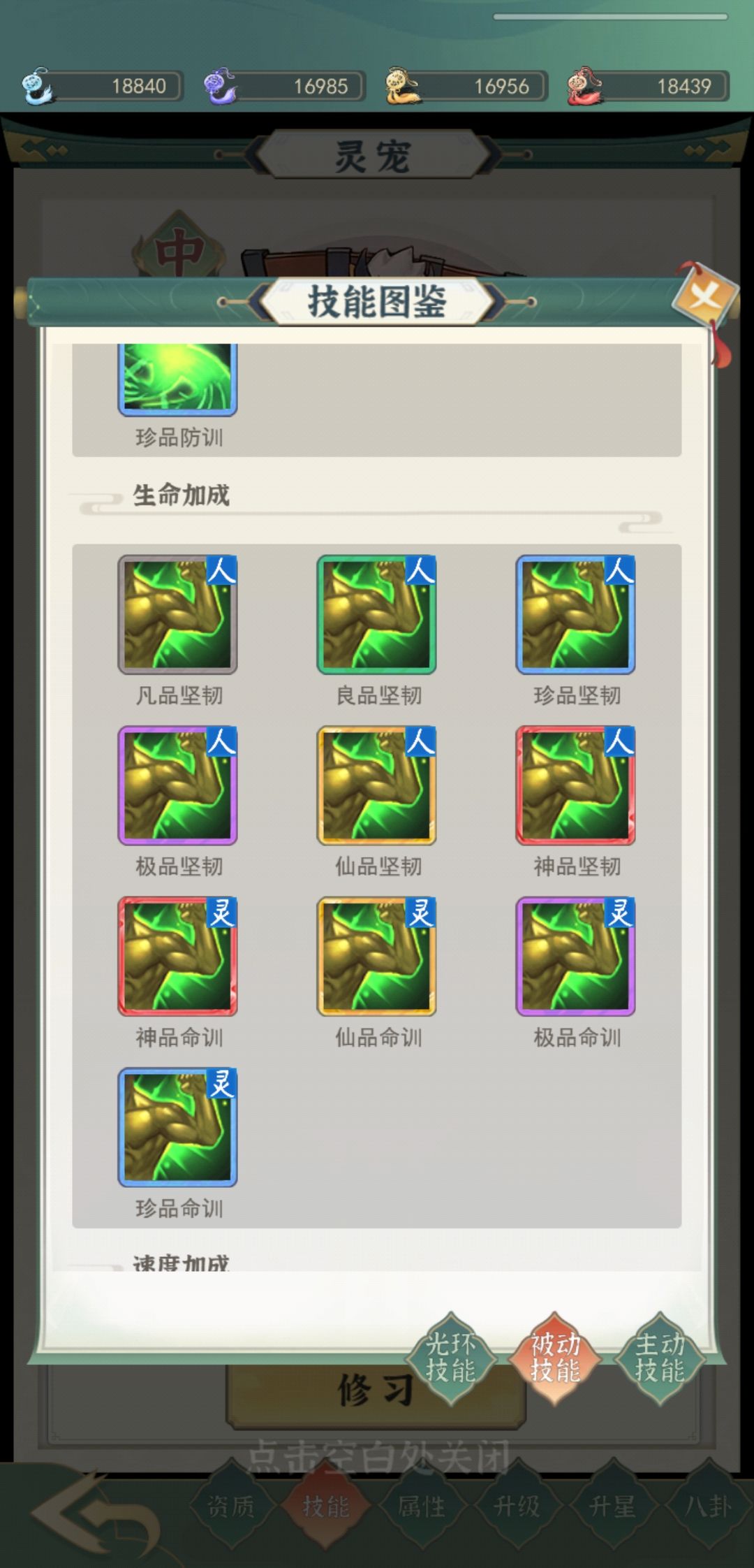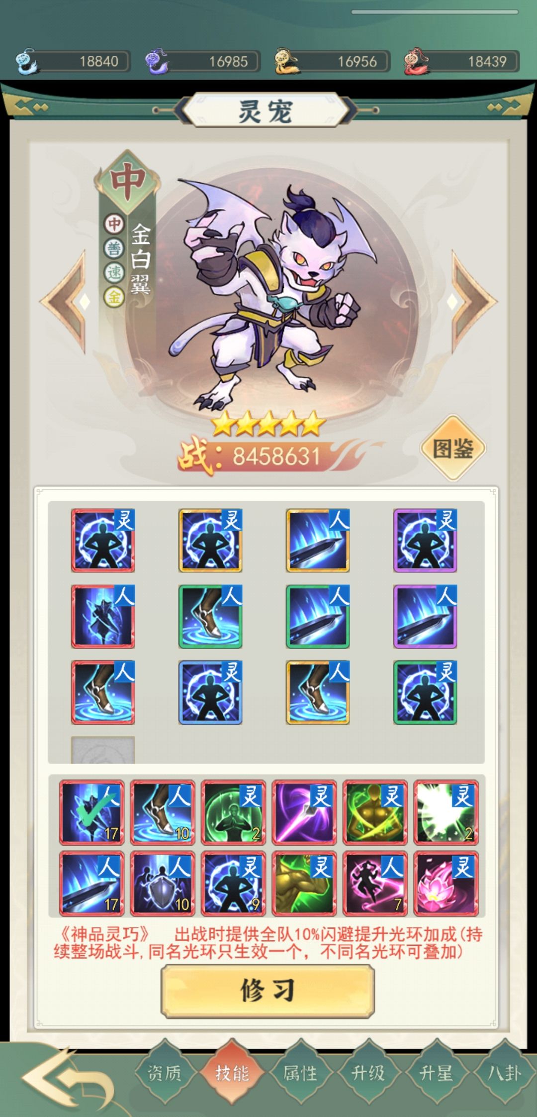 完美的技能搭配就是2个灵主动技+攻击生命速度闪避光环+命训+灵防想要做到这个需要长期玩获得更多的资源开技能槽