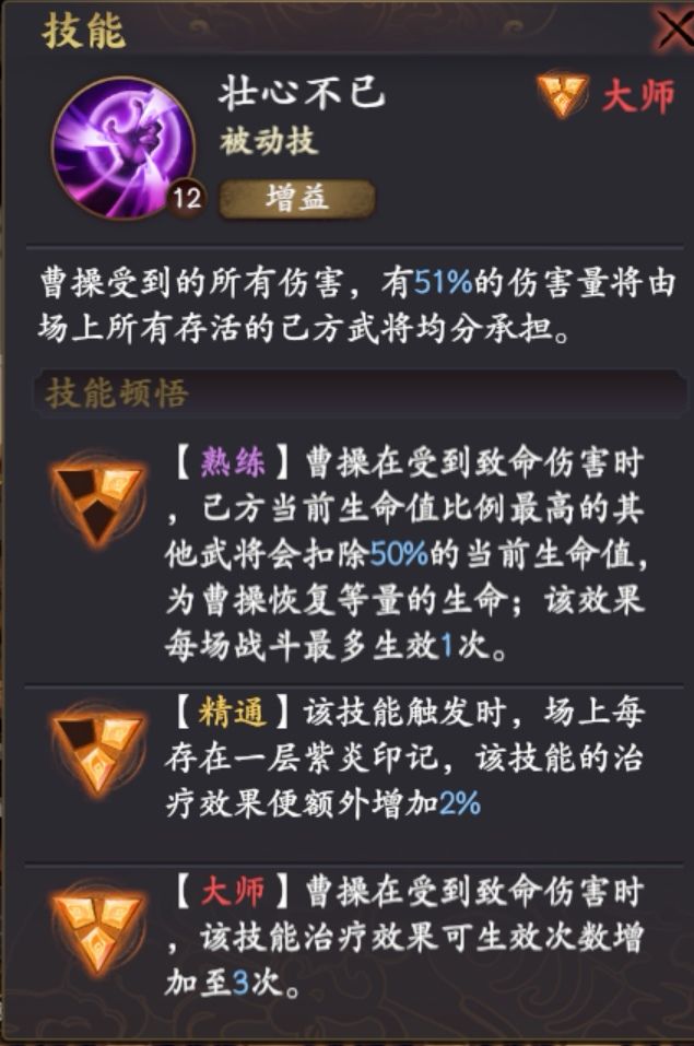 (2)曹操低血线时的每秒回血,也同时享受治疗与被治疗加成。