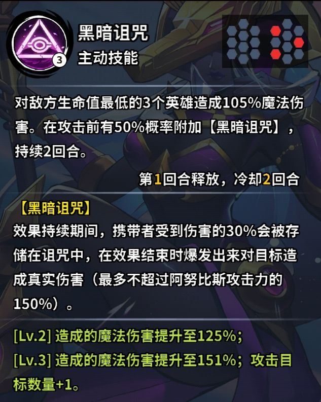 黑暗诅咒:这个是阿奴比斯的核心技能,队友打的伤害可以暂时储存起来,待回合结束引爆并造成真实伤害。这就是为什么阿努比斯基础速度这么快的原因,先手上诅咒,让队友打伤害并储存伤害。