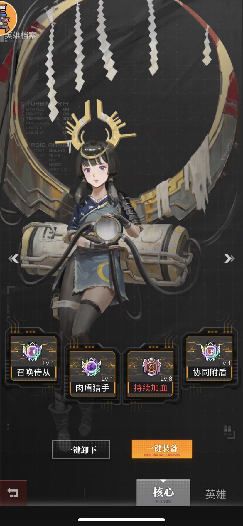 核心:协同附盾配合召唤侍从(1级就行,可以保证你后期单挑时续航能力)持续加血(保证续航) 肉盾猎手(单挑时每次碰撞都多了两三万)如果没有你也可以用增强位移核心