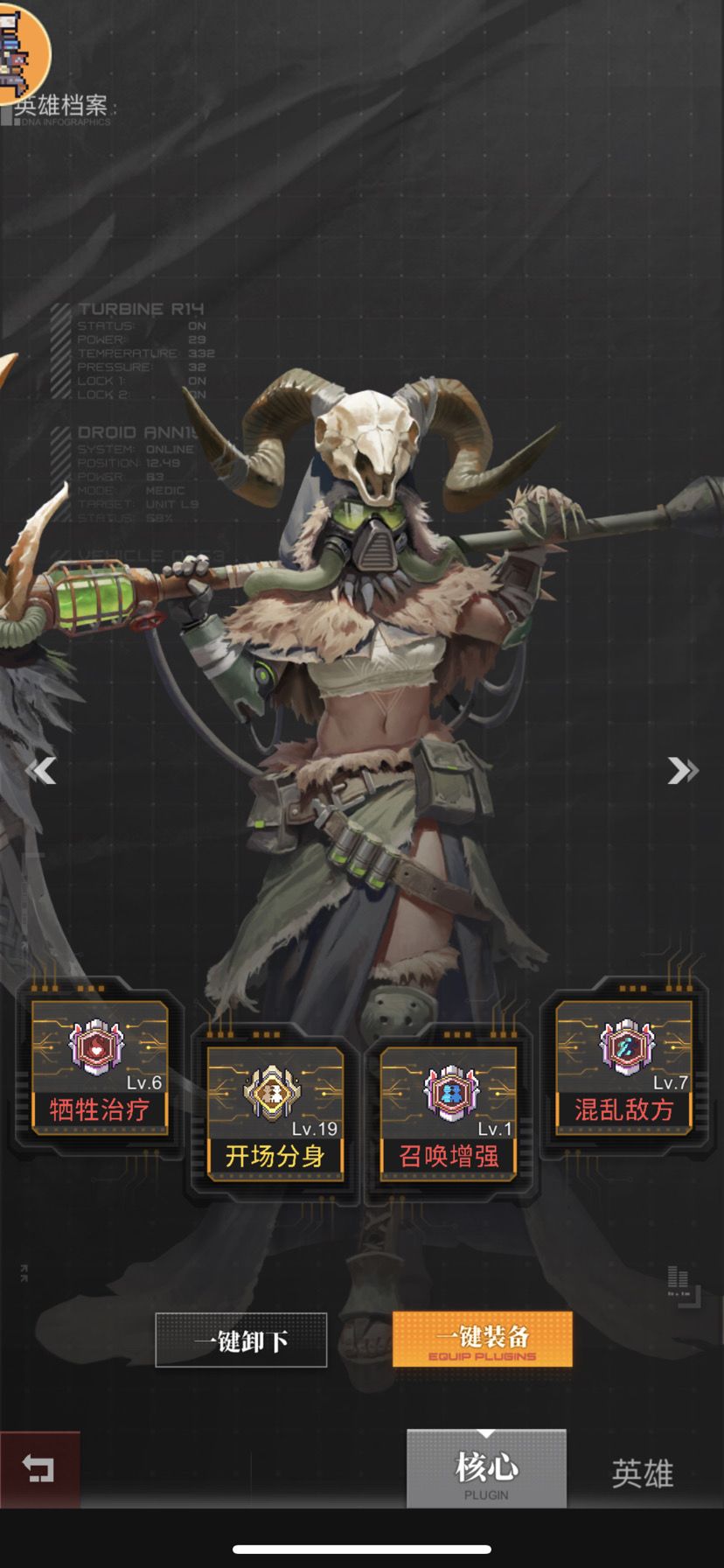 核心:开场分身(尽量最高级,多一个分身就多7万左右的生命上限)召唤增强(低级就行高级给提尔)混乱敌方(必带,我们堆血量的同时也需要消耗敌方血量)牺牲治疗(戴它是为了让海拉血少一点就可以被对方少碰撞几下的死掉)