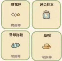 野花环—用花瓣织成的环,能给带上的人送来好运,获取可以得到15颗星,需要招待野果子刺猬185次、牙齿标本—是尖锐的牙齿呢!大概是咕咪掉落的,获取可以得到90颗星,需要招待野猪160次、牙印拖鞋—不知道被谁咬上了深深的牙印,获取可以得到15颗星,需要招待黑色拉布拉多155次、草帽—配上蝴蝶结的草帽,获取可以得到15颗星,需要招揽陨石边牧140次。