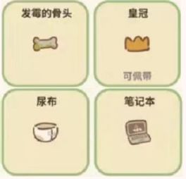 发霉的骨头—骨头上刻着某个人的名字,获取可以得到95颗星,需要评价达到10000星、皇冠—享受一把帝王的待遇,获取可以得到15颗星,需要餐厅营业满90天和招待柯基、尿布—柴犬小宝给动物餐厅的礼物,放心是没有使用过的,获取可以得到155颗星,需要招待柴犬小宝15次、笔记本—把所有的故事都记在笔记本里,可以珍藏一辈子,获取可以得到160颗星,需要招待阿比12次。