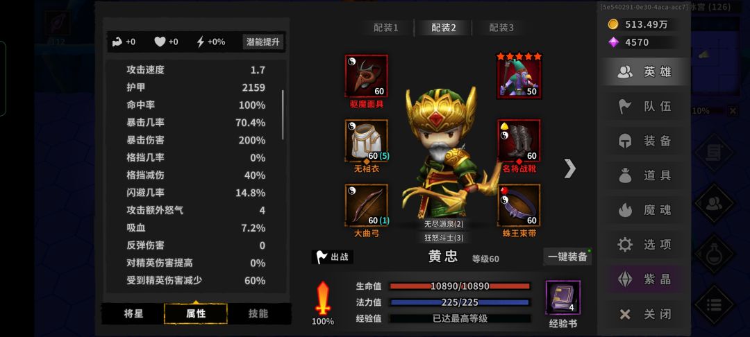 工具人4号,队长无限黄忠,这个不追求异常,做减伤。符文3狂怒2无尽源泉,属性要求1.7速,70暴击,回4怒,2防闪,其余大词条打减精英,我用的野生套装备有两个减10精英,装备打了两个大词条减20精英,共60减精英,有马超给盾,和奉献盾的减伤,反正我的1万血黄忠没有危险,就没有弄魂珠槽打圣灵珠凑90减精英了。相对来说,黄忠对野生套的要求还是非常高的,萌新实在不行的话就打符文吧。魔魂,夜魔巫师要回10条,杂夜魔领主和冰盾/电盾/蜥蜴盾。技能4