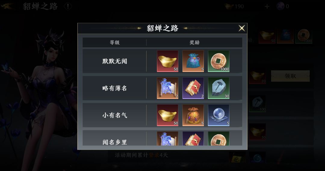 【貂蝉之路】中,各位将军可以通过每日登录、通关活动关卡、完成活动任务获得活跃奖励,累计到一定的【声名】还可领取到声名奖励哦!