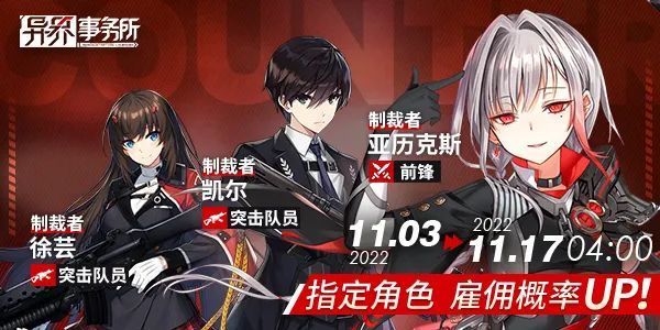请让这些对平静生活有所期待的人,亲手终结悲剧与悲伤。 本周四例行更新维护后,管理局为各特遣实力公司开放职员“徐芸(非觉醒)”、“亚历克斯”以及“凯尔”的雇佣概率UP复刻卡池,老板可根据战备情况选择雇佣。