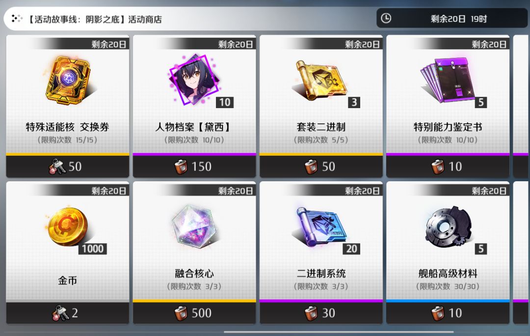 成功挑战ACT.3、ACT.4剧情关卡将得到活动道具“无主的酒壶”,使用该道具将可在活动商店内换取到包括融合核心、套装二进制,【人物档案:黛西(SR)】,二进制系统,黑盒碎片等作战资源。