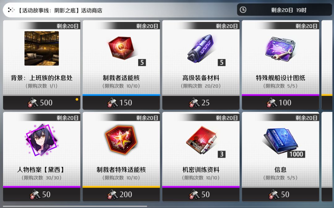 本周四更新维护后,人气剧情活动「阴影之底」开放复刻,剧情故事、剧情关卡、剧情任务以及活动商店将全面上线!成功挑战ACT.1、ACT.2剧情关卡将得到活动道具“开启记忆的钥匙”,使用该道具将可在活动商店内换取到包括【背景:上班族的休息处】,【人物档案:黛西(SR)】,制裁者特殊适能核、高级装备材料等作战资源。