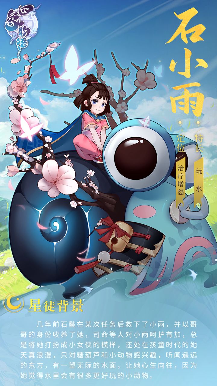 从小在霜刃长大的小雨是个十足的乐天派,几年前石鬣在某次任务后救下了小雨,并以哥哥的身份收养了她,司命等人对可爱的小雨呵护有加,总是将她打扮成小女侠的模样,还处在孩童时代的她天真浪漫,只对糖葫芦和小动物感兴趣,听闻遥远的东方,有一望无际的水面,让她心生向往,因为她觉得水里会有很多更好玩的小动物。