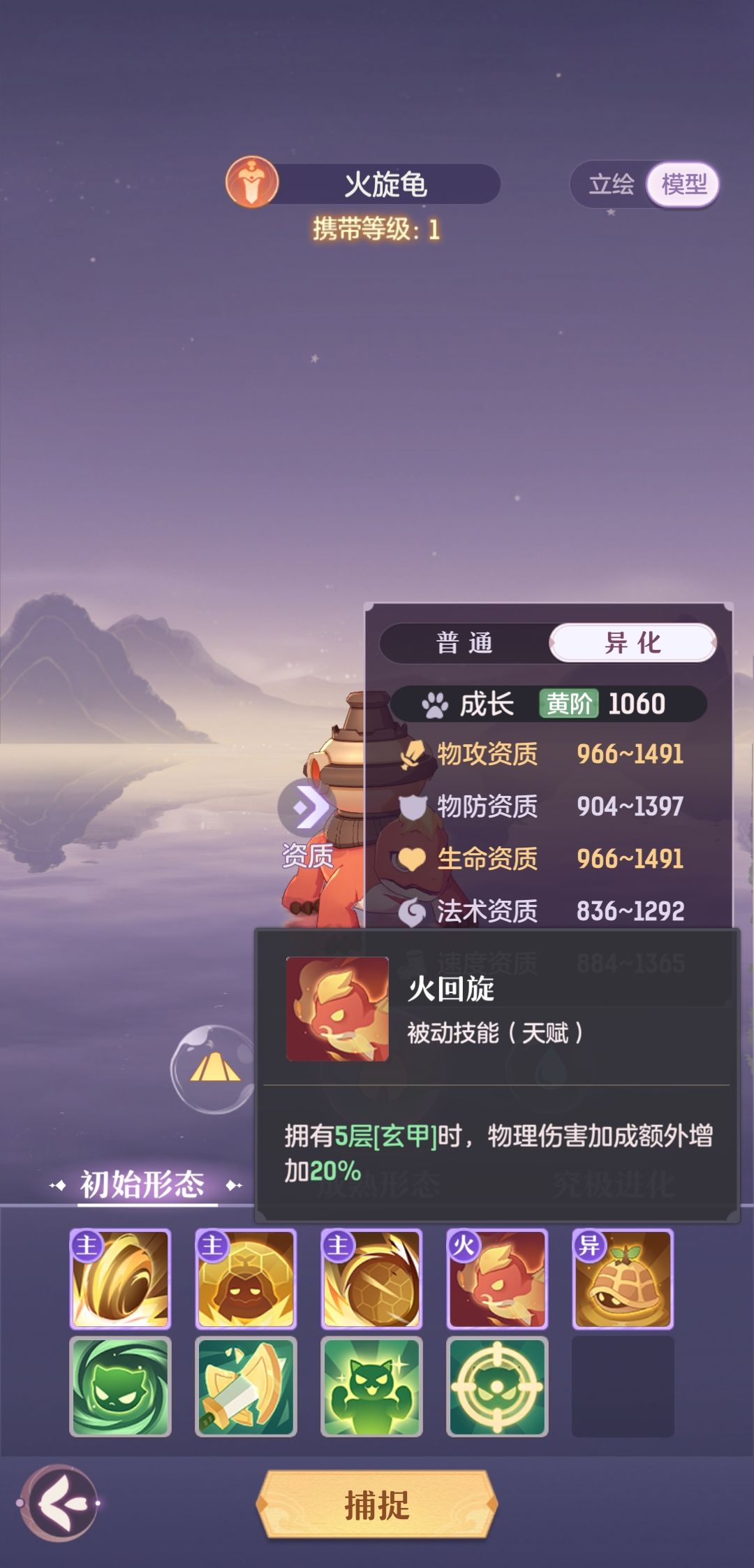 1级宠物有5只,分别是犬(物攻)龟(物攻/半肉)花(法攻)狐狸(封/配速)兔(奶/辅助)
