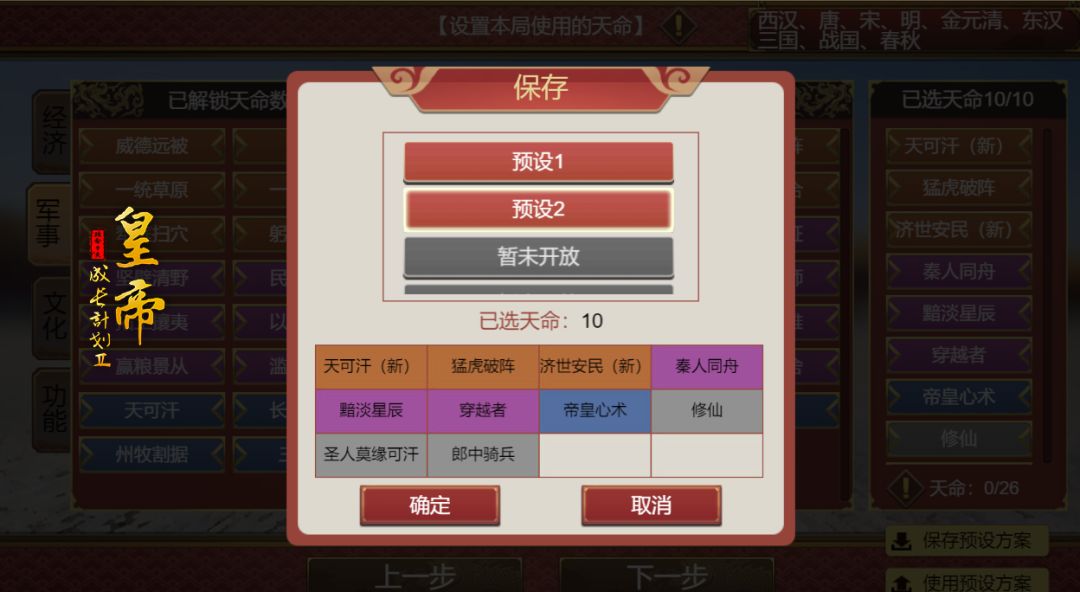 ◆自定义模式下,天命、臣子、美人预设方案多选