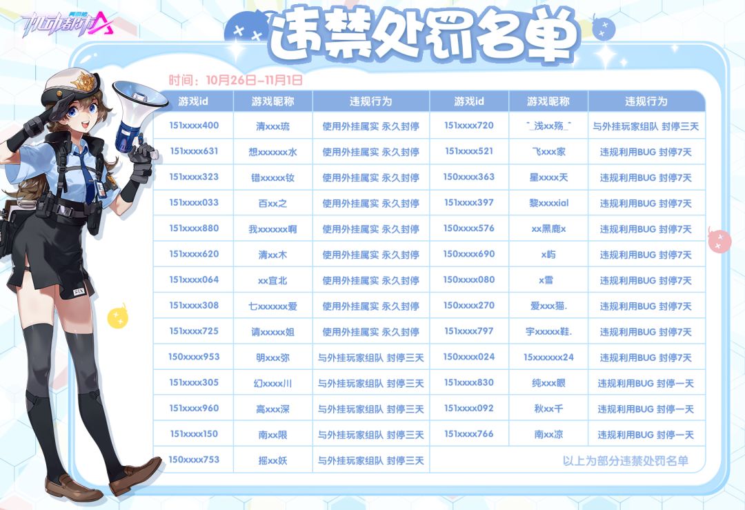 现将10月26日-11月1日的部分违禁处罚名单进行公示: