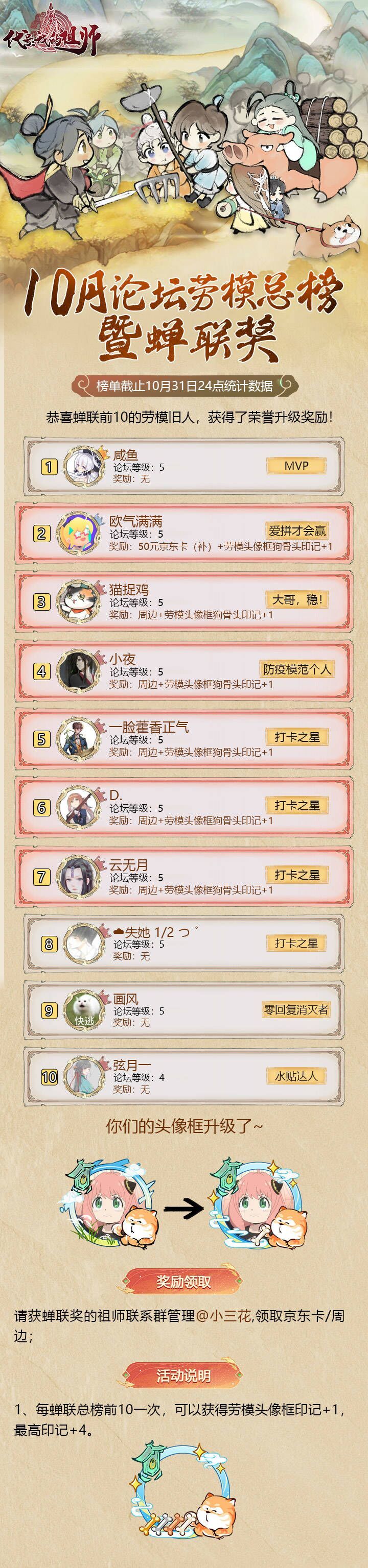 以下为10月新人榜(此前已拿过劳模表彰的祖师未计入):