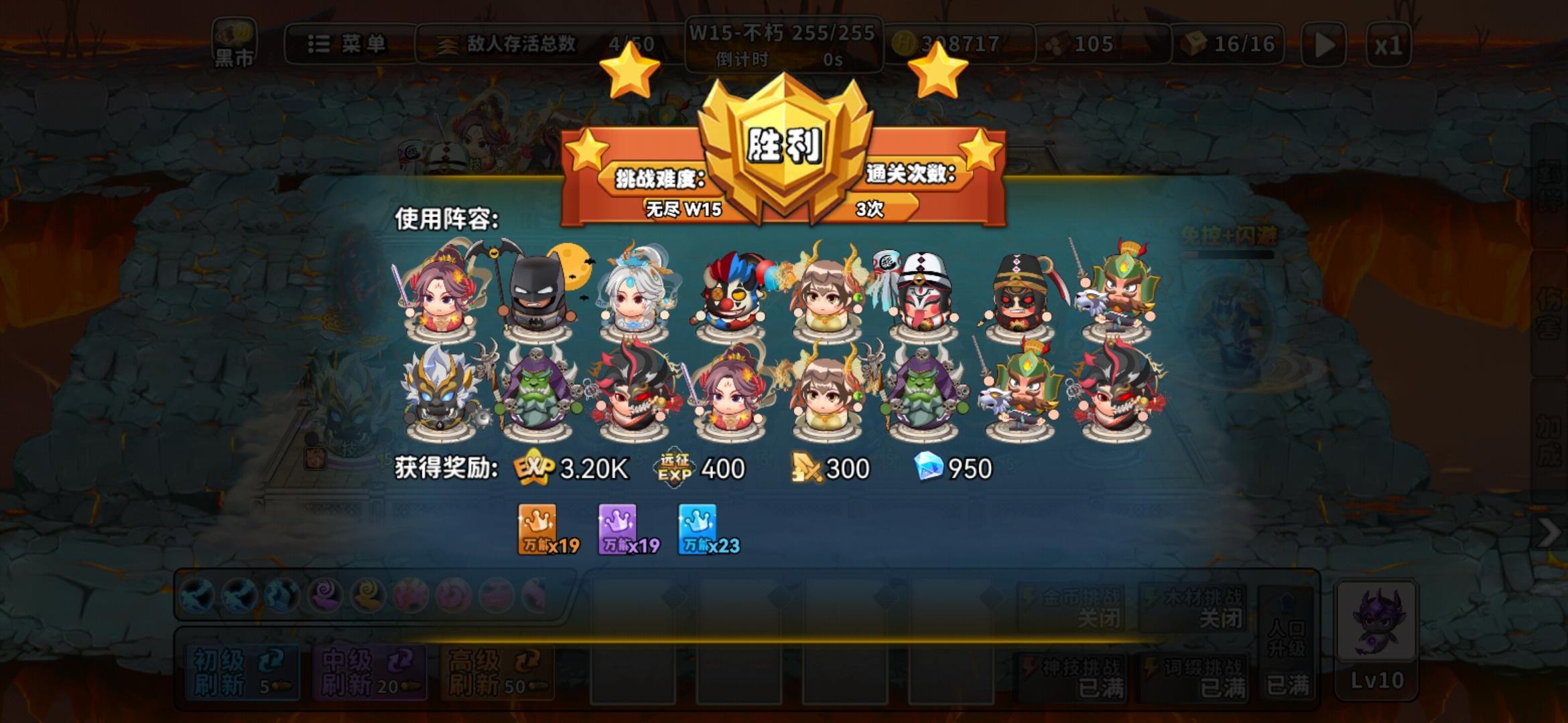 终于过了w15通关了,这游戏前期是真难,后期英雄等级,专属武器,人口都升起来了才勉强通关,遗憾的是除了cd流其他阵容都没法过,这就很单调。