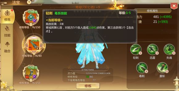 总结:就是第一个卡3打完,就8下轻刺加毒刺,8下轻刺加重斩这样无限循环,这里会发生一个问题,有时候,你八下轻刺打完,但重斩CD还没好,这时候你可以搭配副法宝(太乙靴)技能,再打重斩,就是搭配副法宝(太乙靴)CD还没好,可加2下轻刺,再打重斩。用此手法重斩技能最好点满。