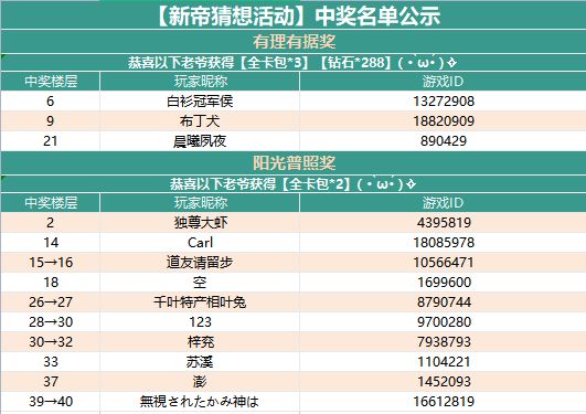 2.从回复中随机抽取3位猜对且有理有据的大人送出:【全卡包*3】【钻石*288】