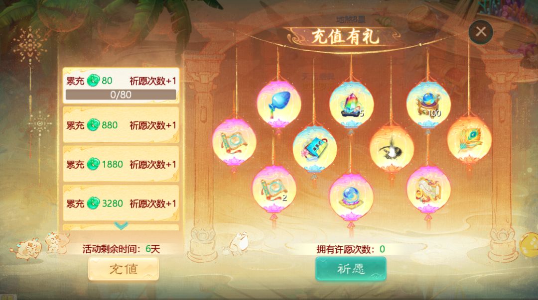 好物节期间,充值仙玉将获得额外祈愿次数!消耗祈愿次数可在“祈愿池”中抽取奖励道具。最多10次祈愿即可领取全部奖励。