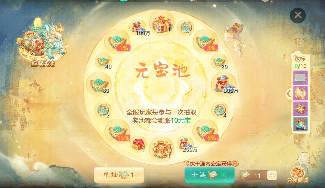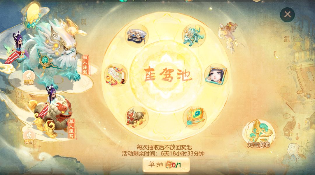 骑灵大奖池来啦!全新座驾、全新头饰、还有海量银两返利全部送上!骑灵转盘奖池额度将由全服侠士共同提升,参与人数越多返利越多!此外,各位侠士达成一定的抽取次数,也能获得额外道具奖励!每天达到一定活跃数值,将会获得免费抽取机会哦!