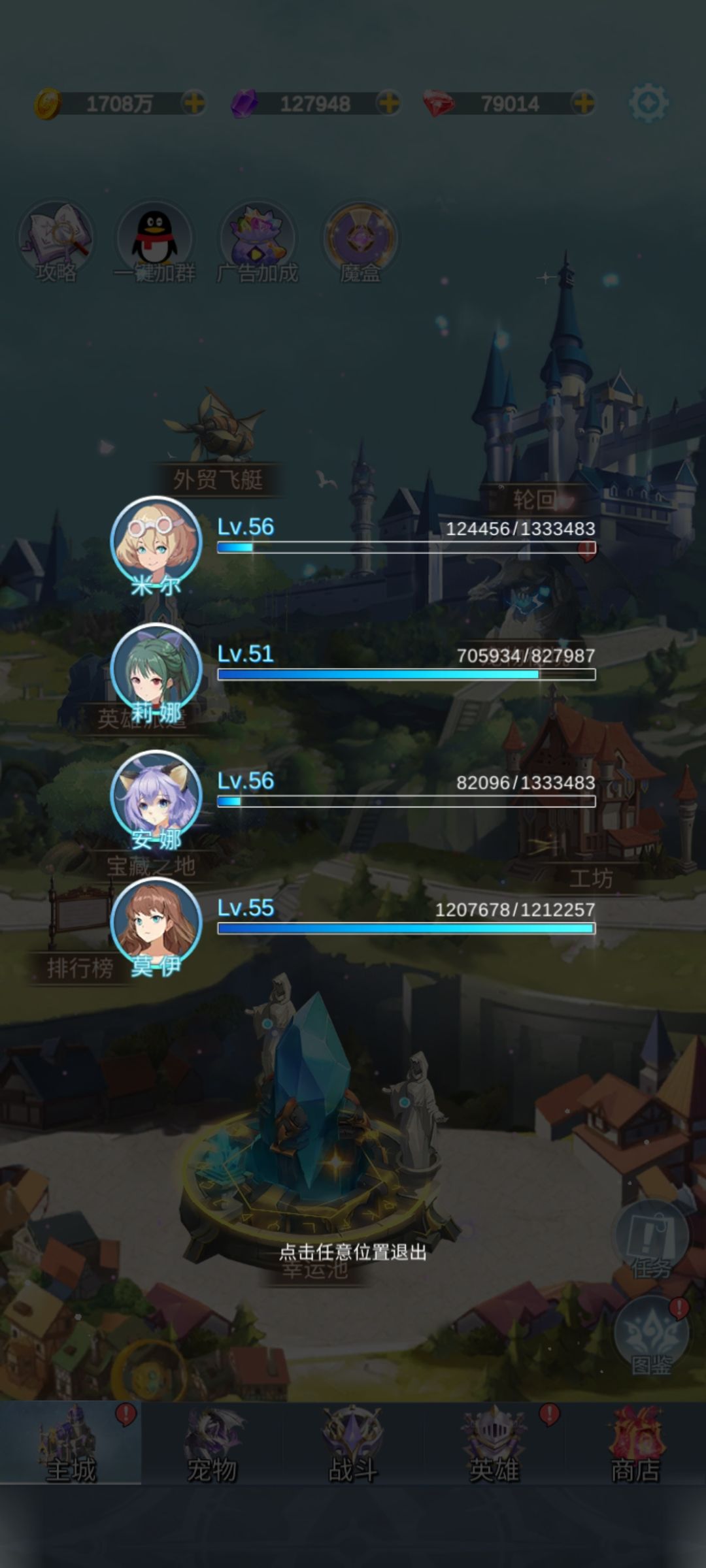 第一天首要任务解锁四个角色,挂机经验是四个角色同时加的,没解锁的话会少吃很多离线经验,并且英雄派遣做多也支持四名英雄同时派遣,前期优先金币和晶石派遣任务,这是前期晶石主要来源之一