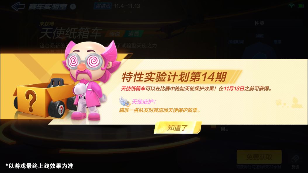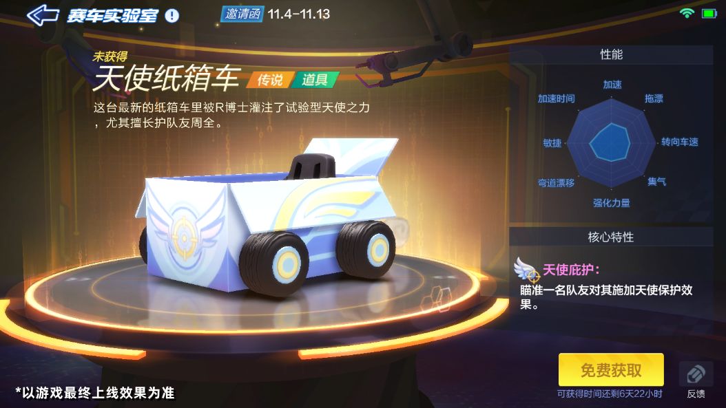 11月13日之前,车友们可以在赛车实验室领取并体验这款全新的【天使纸箱车】,快来帮助R博士收集更多实验数据吧!