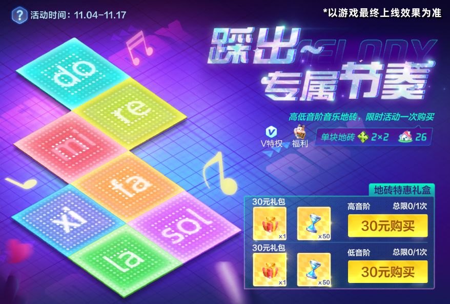 11月4日-11月17日,福利站将限时开启【踩出专属节奏】活动,活动期间可直购地砖特惠礼盒,支付成功后即可立即获得对应的高(低)音阶地砖礼包和时间沙漏。直购金额自动计入V积分,并支持激活招财猫和进宝猫。