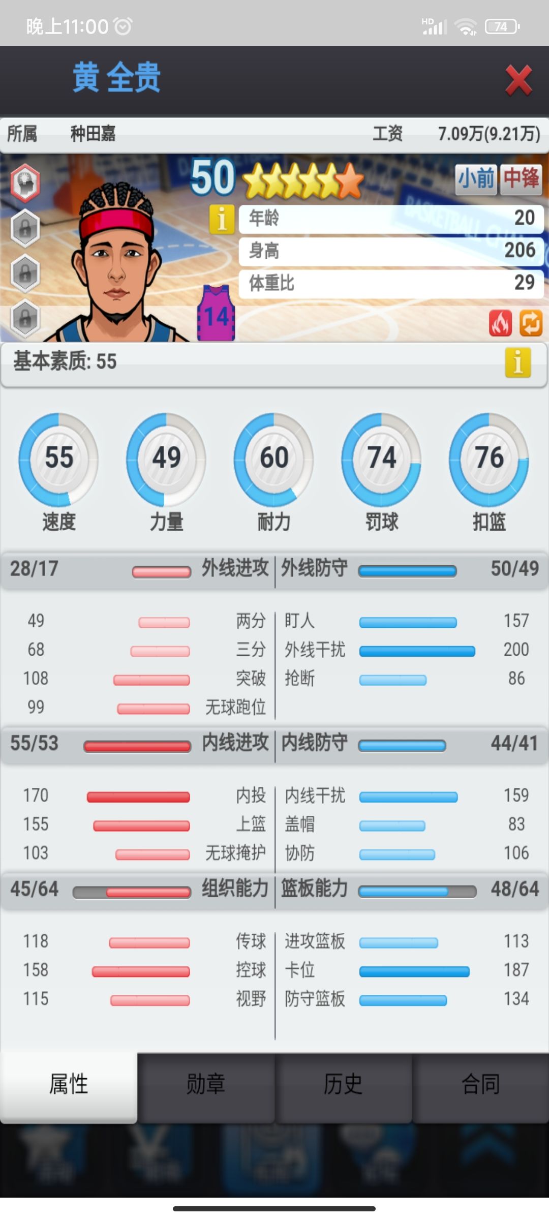 可以看到,这个球员的属性并不突出,除组织外并没有超过50点上限的能力了。但是在购买球员时,首先考虑他在队内会是什么定位;比如这位球员,他的定位是“突突发牌员”,即作为控球后卫,在队伍中担任进攻的策动者,主要负责突进、寻找防守缺口并喂出助攻,具备一定的单打能力,并在对位防守对方后卫时,尽量取得一些优势。