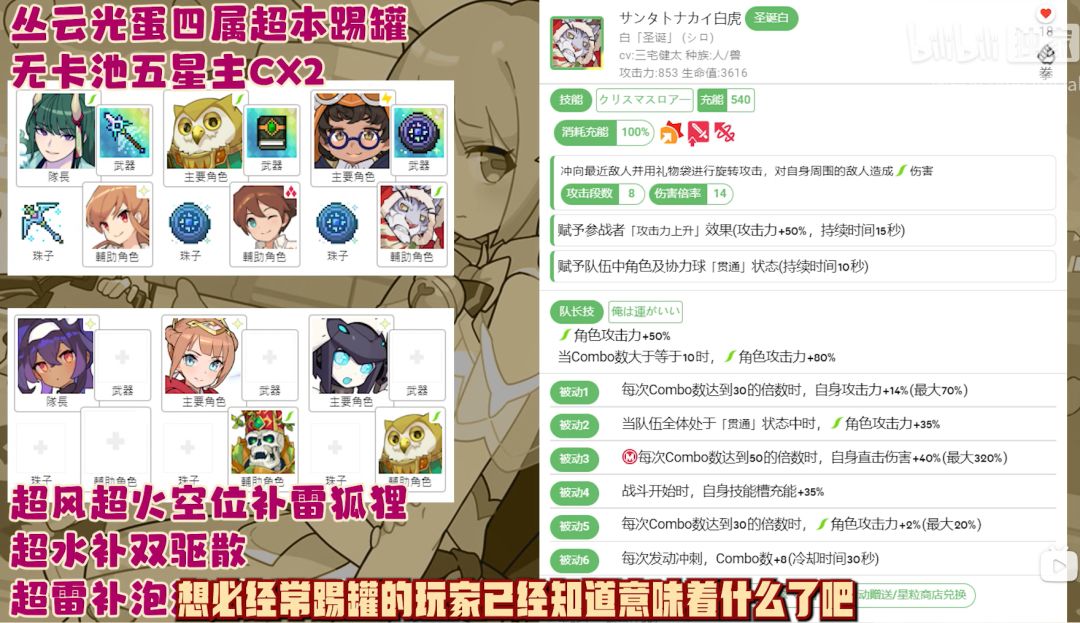 本次高加踢罐队伍有很多,大多数攻略视频都没有提及,在这里我只给出一个双人踢罐配队,根据十连彩光大佬的视频演示来看,伤害相比较丛云光弹来讲很难打到,如果后面有别的踢罐队伍我会加在帖子里