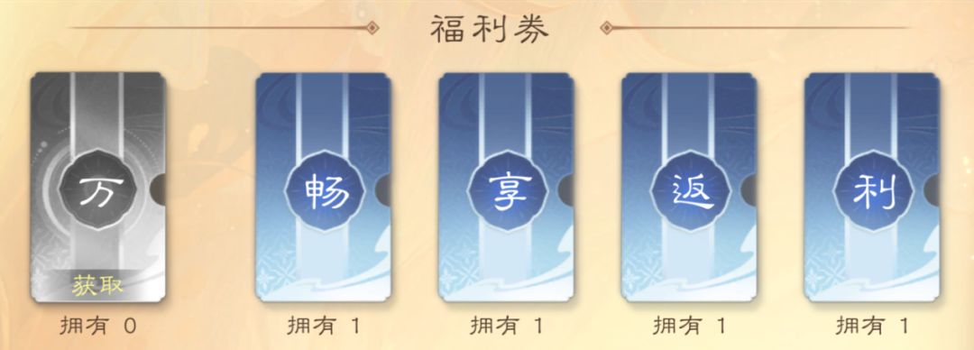 其中包含的【畅】、【享】、【返】、【利】四种道具,集齐四字即可兑换一张畅享券,在购买礼包后使用礼券将获得不同数额的绑玉返还。