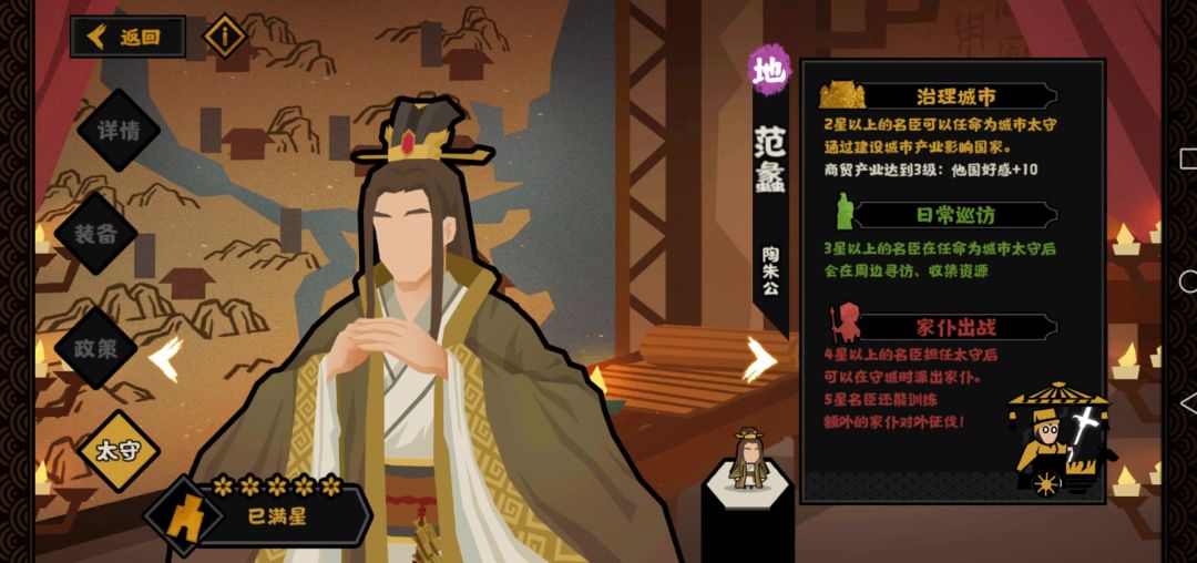 1.范蠡:太守初始效果是其他势力好感+6,每级装备额外提升4点好感。满装备是一个三级建筑提供30好感。升级的主要目的是为了配合伯牙子期的好感提升战力。在国家数量比较多的地图适合拿出来。