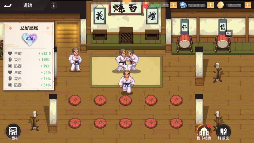 这家道馆可是一番街里知名道馆(因为就这一家当然知名啦!),里面收集了世界各地的格斗家档案,学员给格斗家们赠送礼物,还可提升格斗家好感度,解锁格斗家传记、头像和语音。