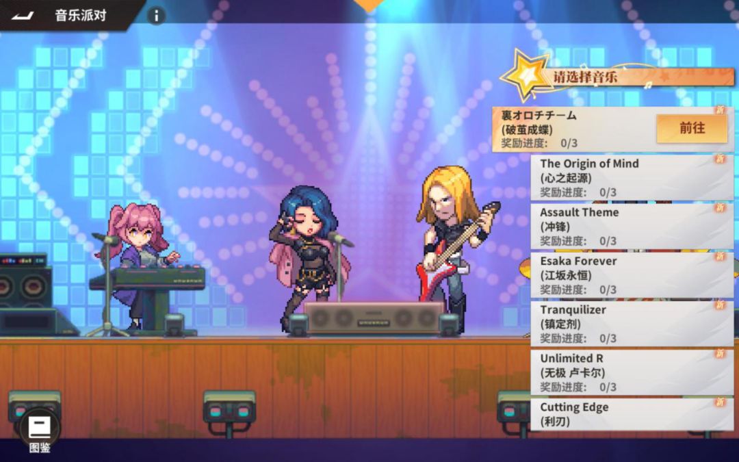 音游小能手集合!在音乐派对中你可以选择自己喜爱的SNK系列作品bgm,依照音乐节奏和画面指示点击音符来获得积分,解锁不同图鉴物品!