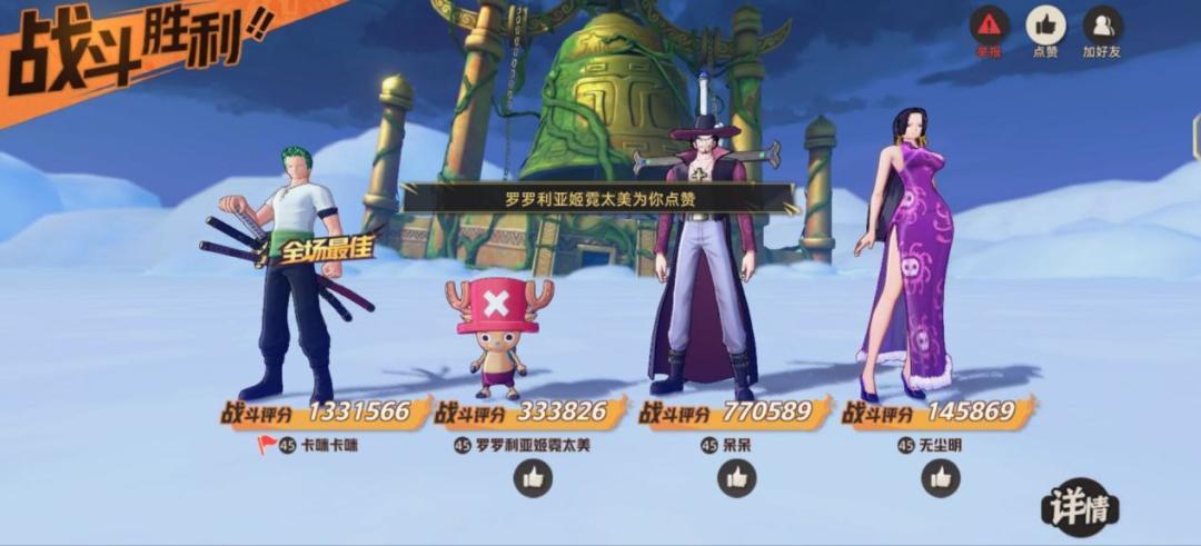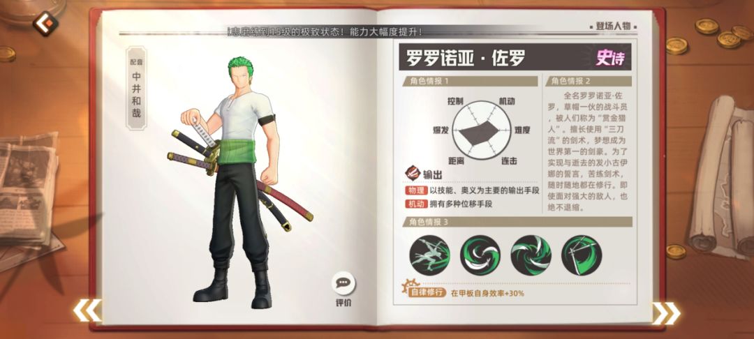 前期SSR星级天赋不高的时候索隆可以利用自身的星级和天赋优势,利用好蓄力和鬼气的增伤,熟练操作后可以更快拿下伙伴对决获得橙卡。