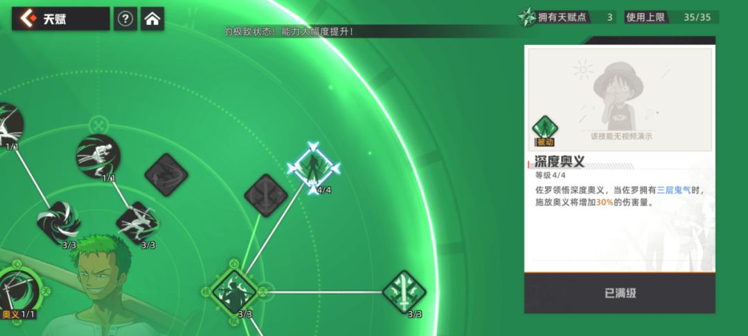 因为索隆的伤害可以媲美SSR,所以索隆的短板也是非常明显的,那就是非常的脆,同样的伤害SSR扛三下,索隆可能两下就无了,打BOSS的时候要尽量不吃伤害,不然肯定是全场第一个去世的,所以玩索隆可以适当点一下他的闪避天赋,也不用担心闪避会影响鬼气叠加,技能+闪避之后再蓄力依然可以叠加鬼气。