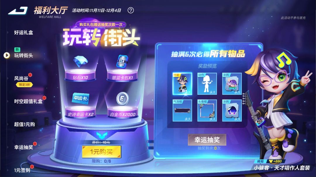 抽满6次必得角色时装小骇客·天才唱作人套装!