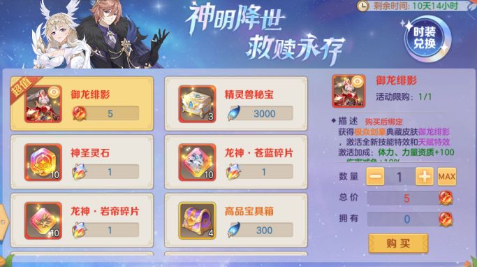 精灵羁绊宝箱(打开必得幻想灵珠x10,概率获得精灵兽魂、圣歌风铃等)、曙光好礼。