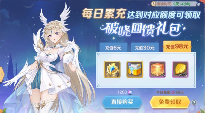 ✦每日累充达对应额度可领取破晓回馈礼包(也可使用钻石直接购买);