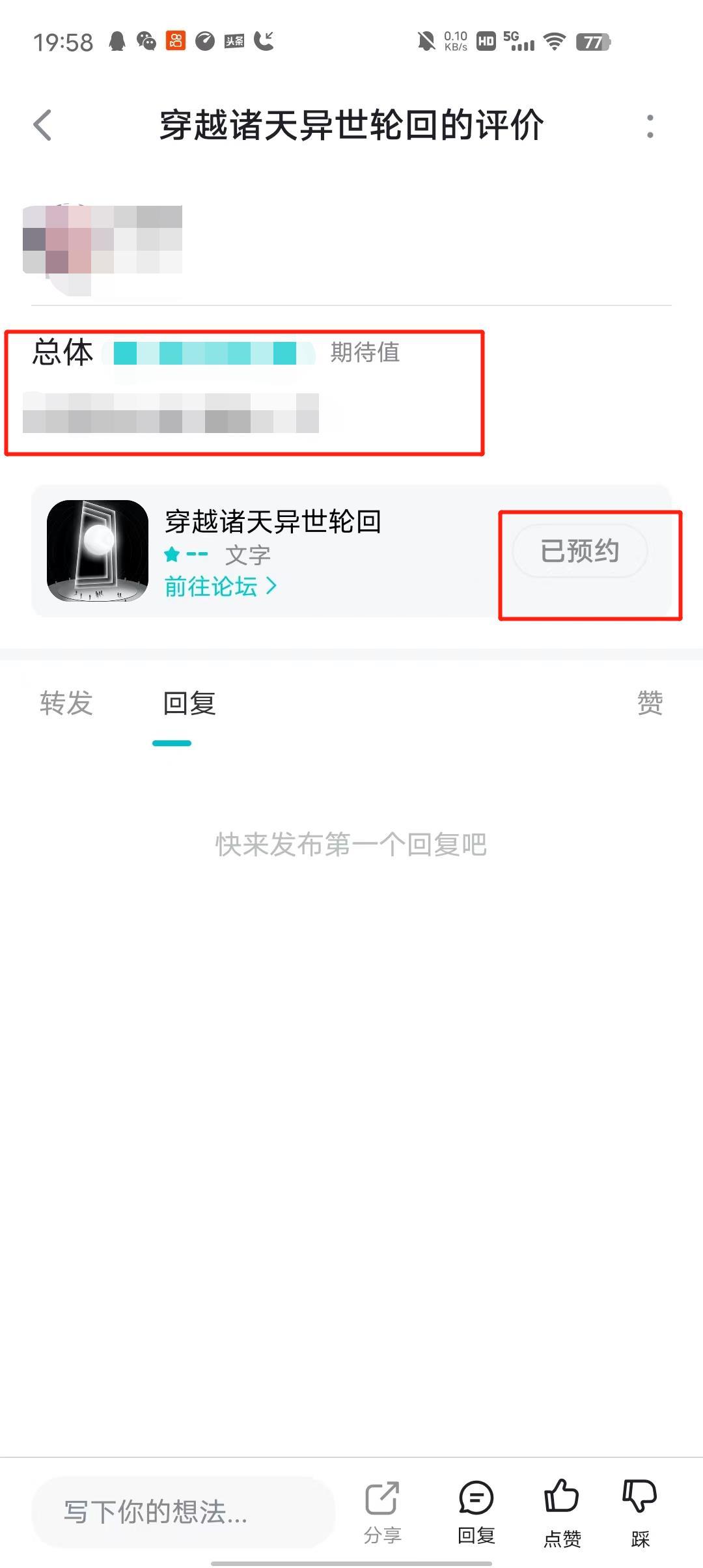 预约并打分评价《穿越诸天异世轮回》,并在该帖内发送评价区评论后截图,如:以下示例