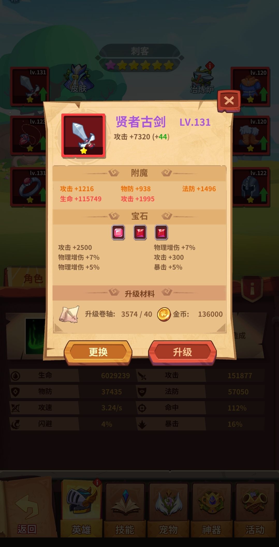6神器,就是免费送你战力的东西,降低需求,减少消耗的东西,比如,合成装备需求金币下降,挂机收益提高,商店刷新速度提升,宠物栏提升等等,你只要慢慢爬英雄塔,做宠物任务总能领到免费的箱子,并且不要小看任何神器,哪怕只是蓝色。