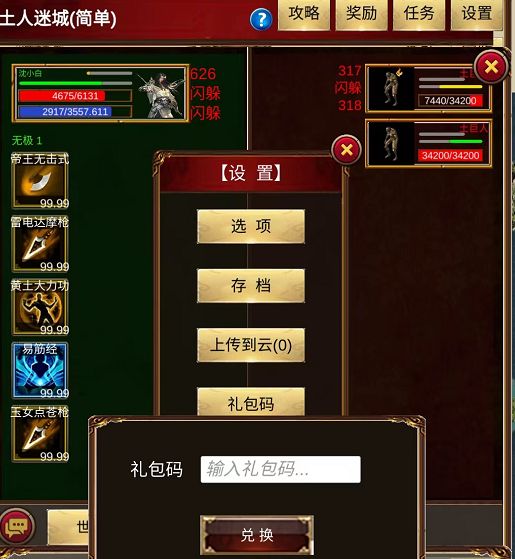 第一步:新人(尤其是小白),你出生了!先什么都不要干,对就是什么都不要干,打开设置看到礼包码选项输入dl888等等一大堆礼包(其他礼包码本论坛或者去QQ群查看),然后你的物品栏会多了两本武功,一本武功闪光斧,一本北冥闪光斧(是闪光斧的升级版,等造化境才能修炼,元气80即可,元气每练满一门武功加对应元气值,重武功加元气多,列入闪光斧可以加十几点,无影脚仅仅3点)。