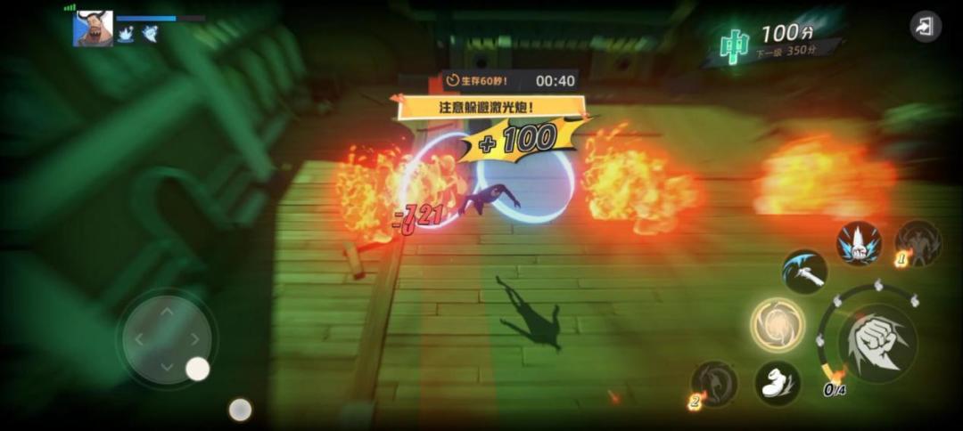 躲避关有两种都是在1分钟内尽可能的存活下去.一种是躲避炮火,一种是躲避来回滚动的球。躲避炮火的时候有红色的技能预警,躲避球的时候有小球可以吃了回血。