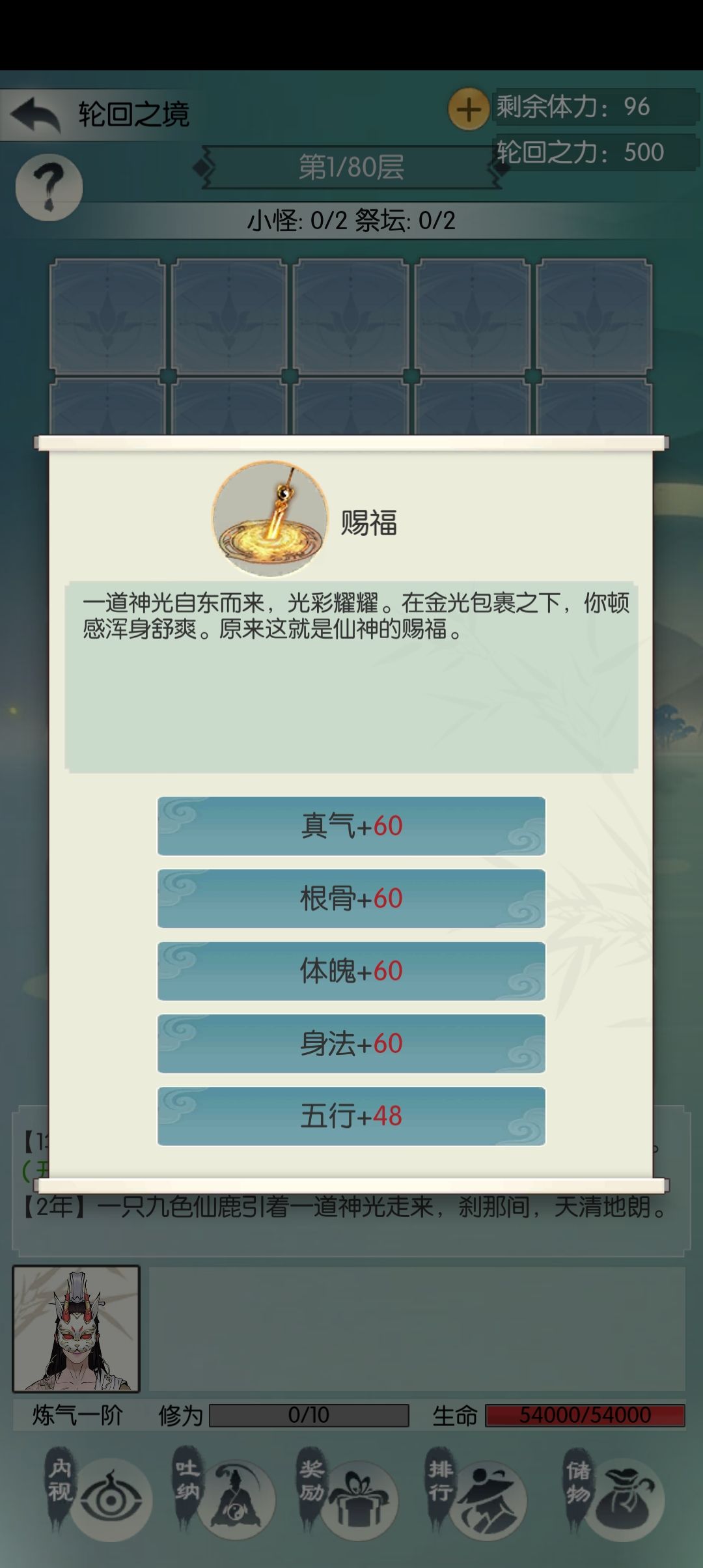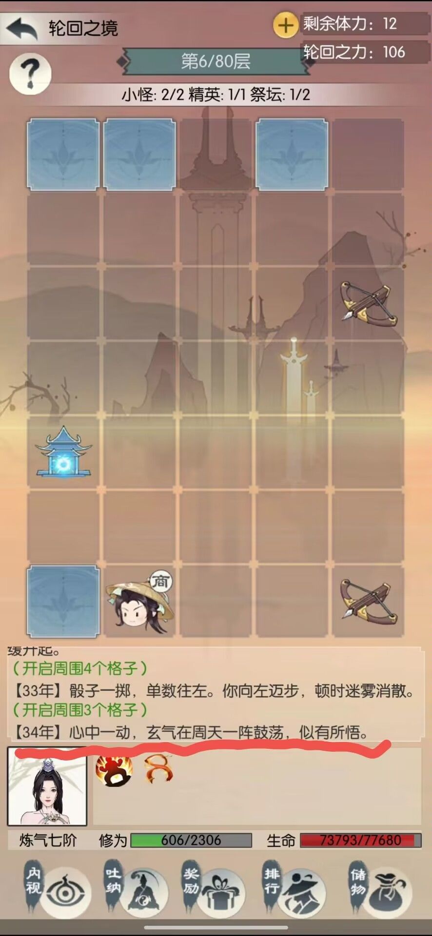 开局正常拼脸翻牌子就行,(注意的是轮回里面是没有回血招式的,所以回血方式有三种,在商人处购买蒲团使用,升级境界,以及地图上的甘露水,所以我们在整体推图的过程要注意自己的血量,以及经验)