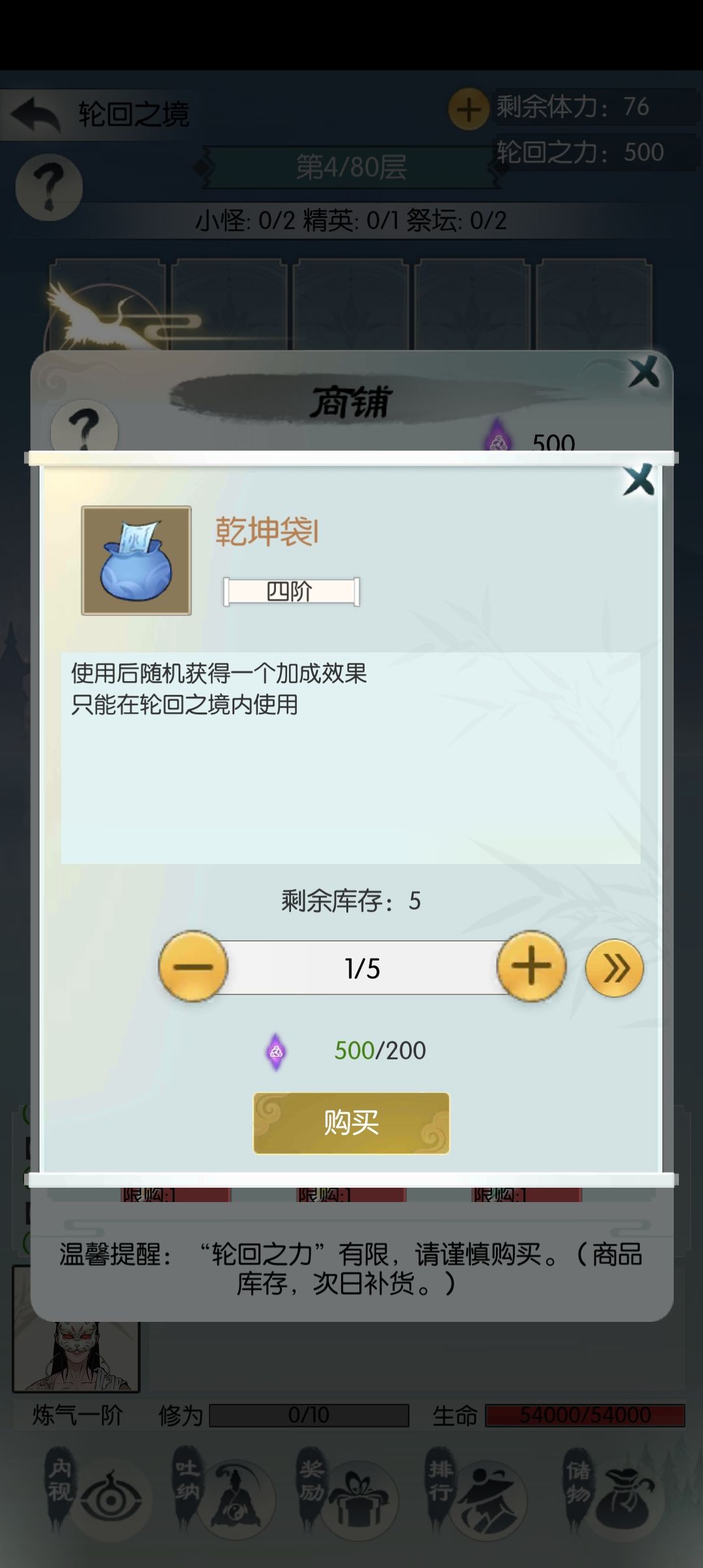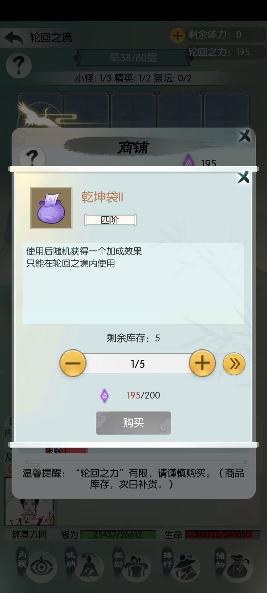 根据和群里织夏,团子等大佬们玩五行的交流以及自己的实践,我们可以看一下自己的战斗过程进行判断,是否需要在前期在商人处买袋子补四维,这里推荐大家在30层之前不买袋子,因为30之后袋子就开始升级,我们攒轮回之力,放在30之后开始大买补充四维,可以提高一个不错的性价比。