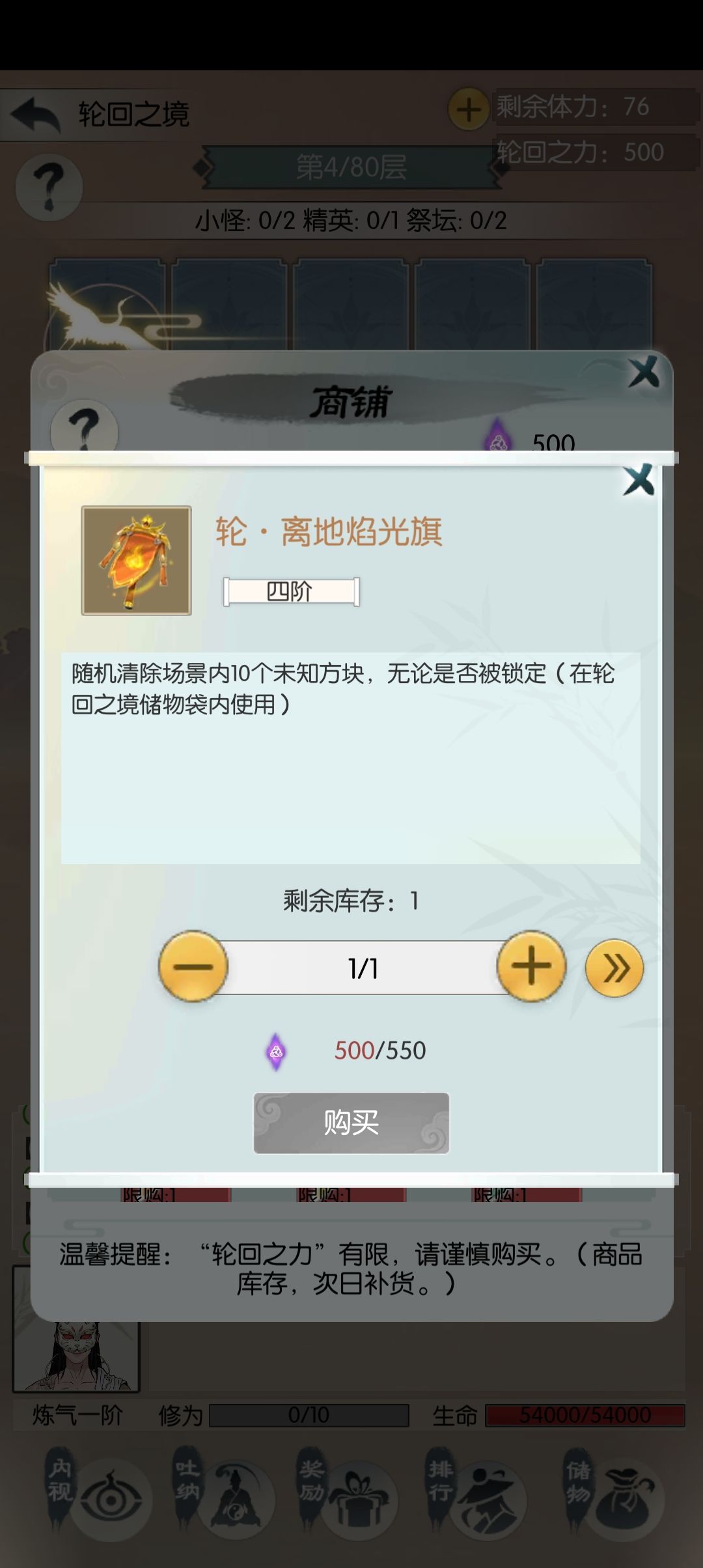 关于回血蒲团其实我的整体通关下来买的并不多,对于第一次接触轮回的玩家细节不到位可能会需要一点,后面基本很少用去买蒲团,如果我们主意升级经验,对于血量是有很好控制的,并且打到后面怪物提供的经验很多,升级非常快,(注意轮回之境死亡后有免费五次复活,五次免费用完后需要用到仙玉复活,但仙玉复活并不是无限