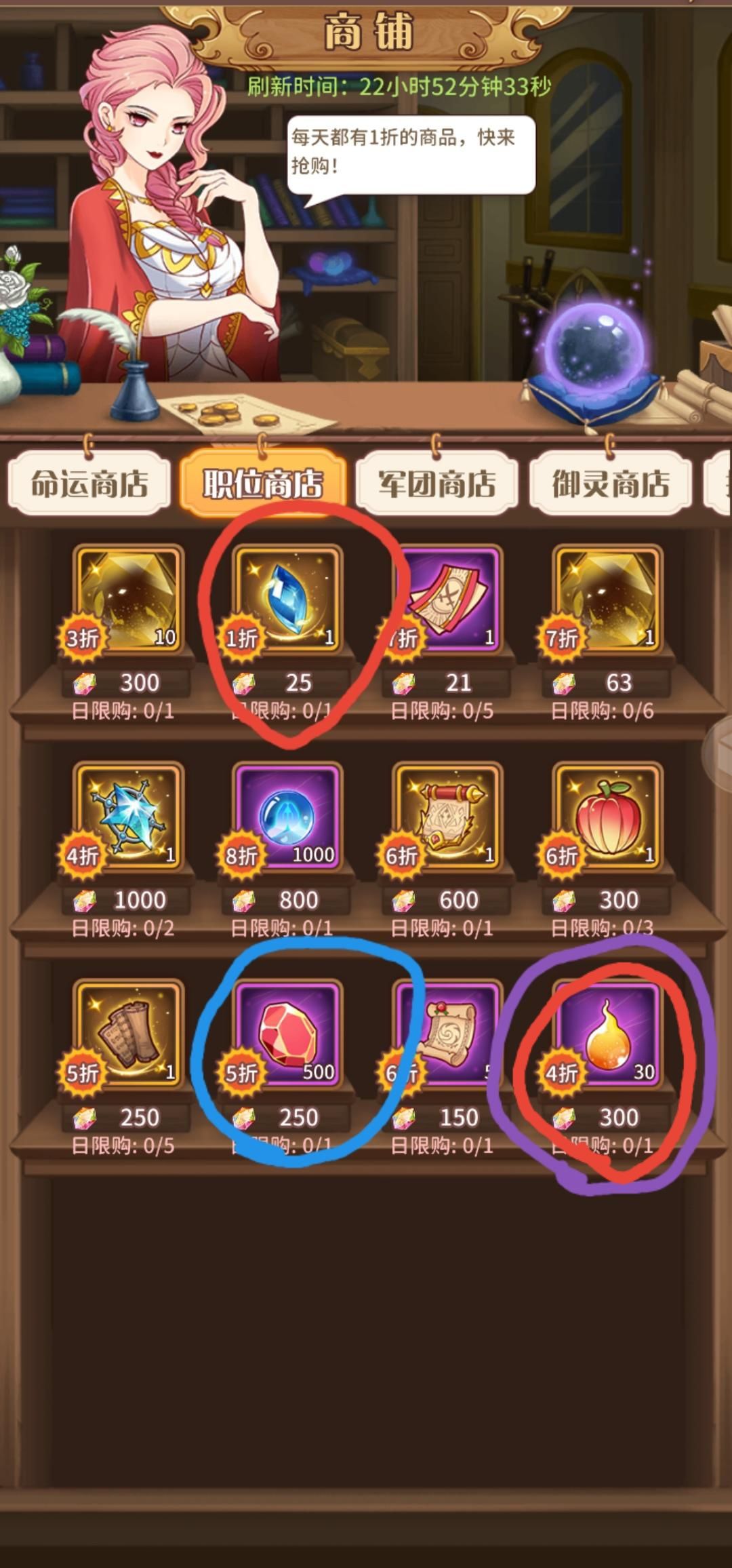 ②职位商店v3解锁(1折眼泪必买。女神像必须5个全到40级才可以突破御灵240级,魂火挺缺的,建议先买着)